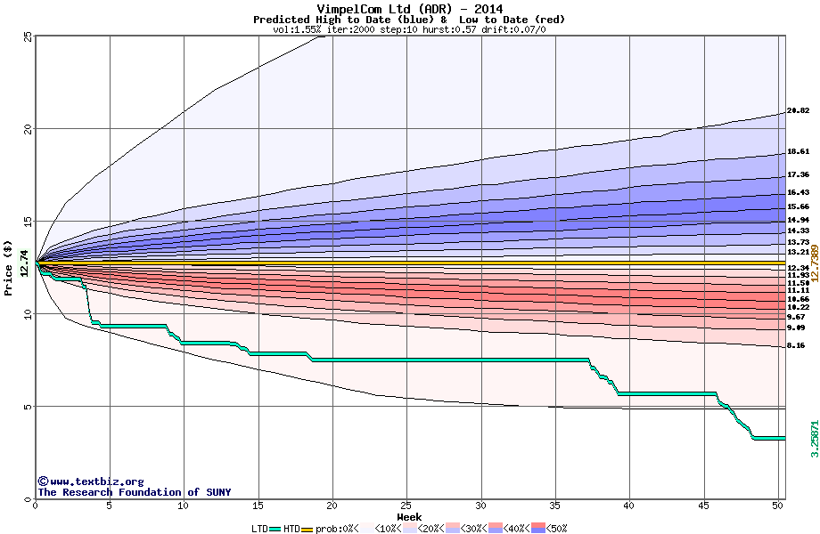 The high to date and low to date prices of the stock plotted against a random walk model for 2014 (what's this?).