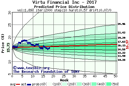 The high to date and low to date prices of the stock plotted against a random walk model for 2017 (what's this?).