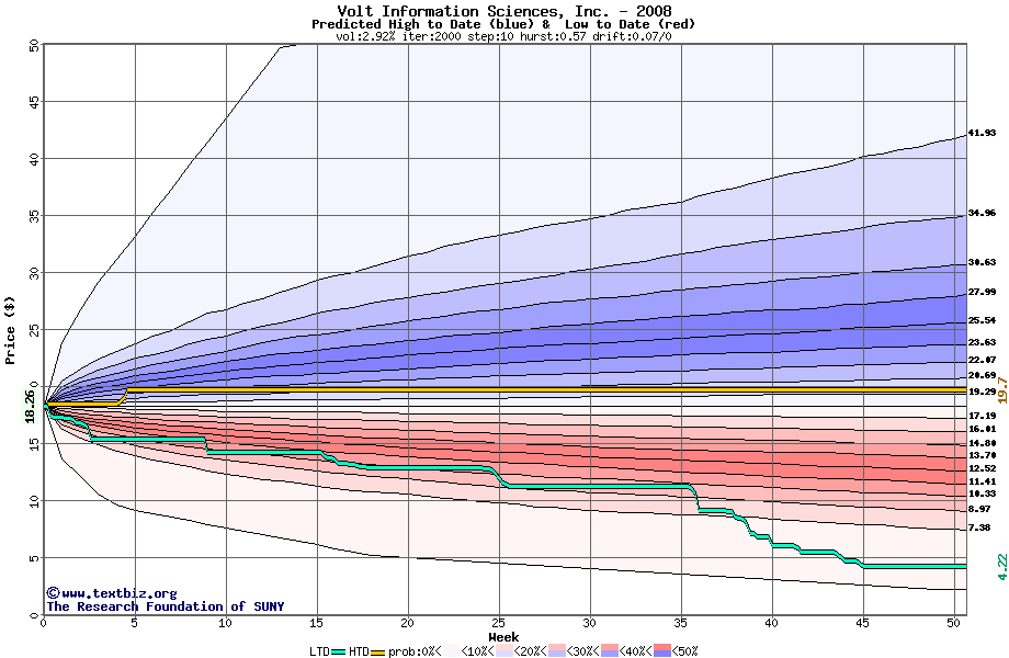 The high to date and low to date prices of the stock plotted against a random walk model for 2008 (what's this?).