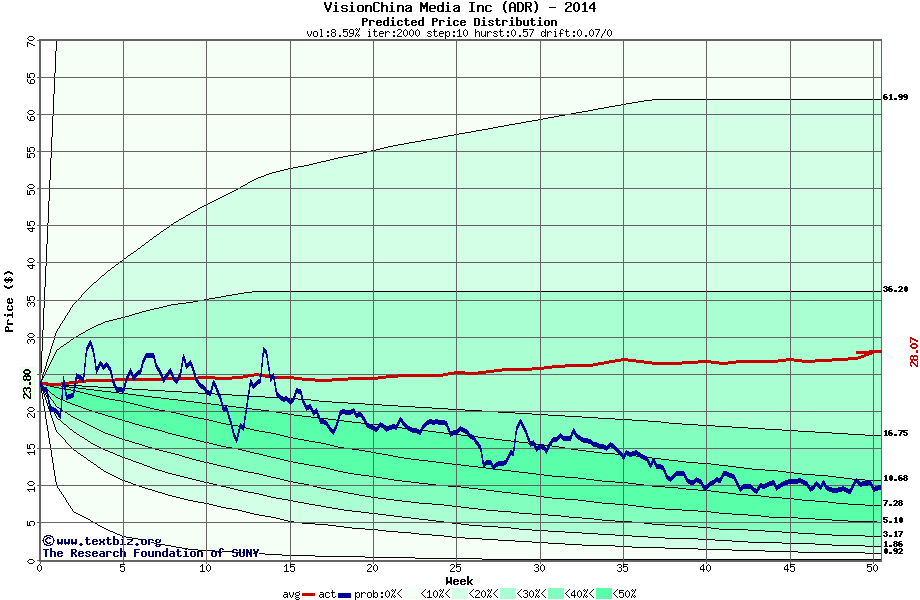 The following graph plots the year-to-date performance of the stock for 2014 compared to the probability calculated by a random walk model.