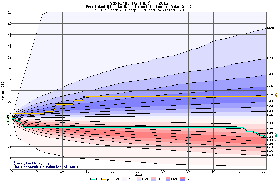 The high to date and low to date prices of the stock plotted against a random walk model for 2016 (what's this?).