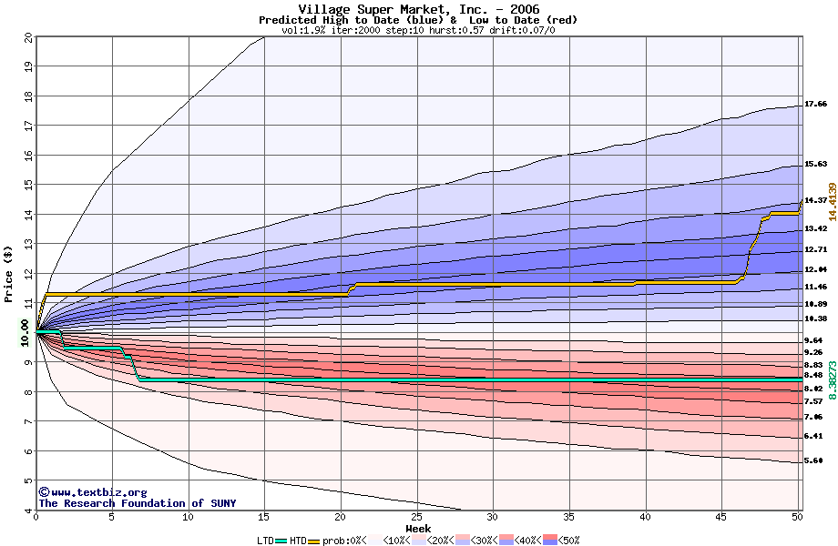 The high to date and low to date prices of the stock plotted against a random walk model for 2006 (what's this?).