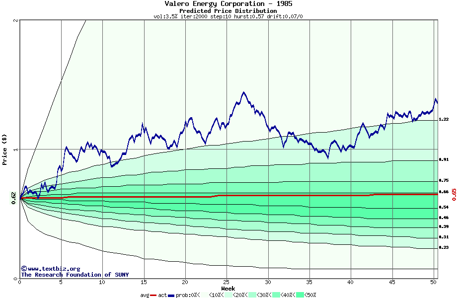 The following graph plots the year-to-date performance of the stock for 1985 compared to the probability calculated by a random walk model.