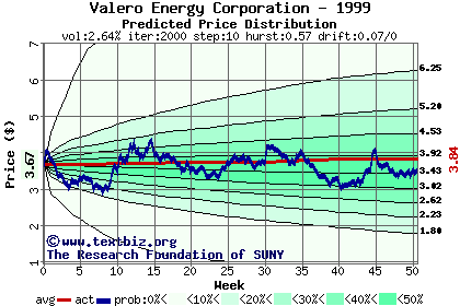 The high to date and low to date prices of the stock plotted against a random walk model for 1999 (what's this?).