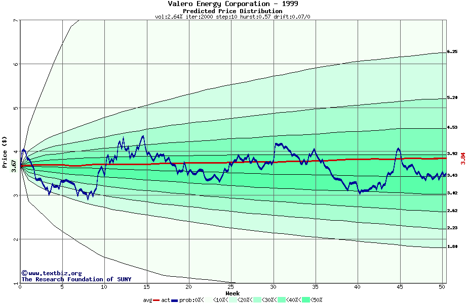 The following graph plots the year-to-date performance of the stock for 1999 compared to the probability calculated by a random walk model.