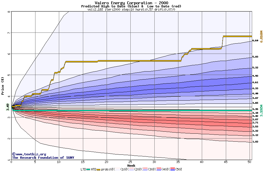 The high to date and low to date prices of the stock plotted against a random walk model for 2000 (what's this?).