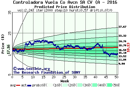 The high to date and low to date prices of the stock plotted against a random walk model for 2016 (what's this?).
