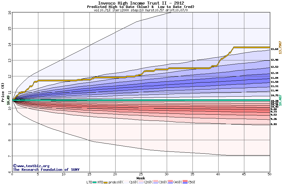 The high to date and low to date prices of the stock plotted against a random walk model for 2012 (what's this?).