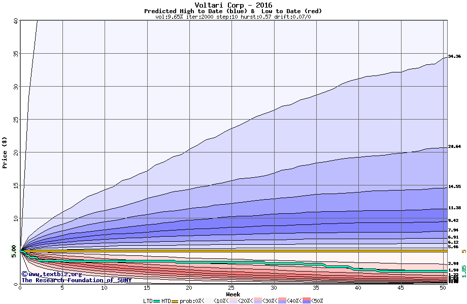 The high to date and low to date prices of the stock plotted against a random walk model for 2016 (what's this?).