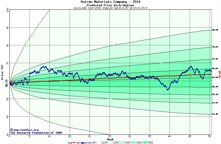 The following graph plots the year-to-date performance of the stock for 2014 compared to the probability calculated by a random walk model.