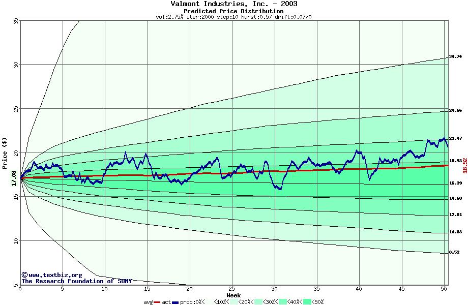 The following graph plots the year-to-date performance of the stock for 2003 compared to the probability calculated by a random walk model.