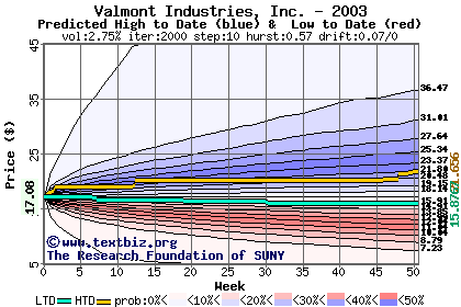 The high to date and low to date prices of the stock plotted against a random walk model for 2003 (what's this?).