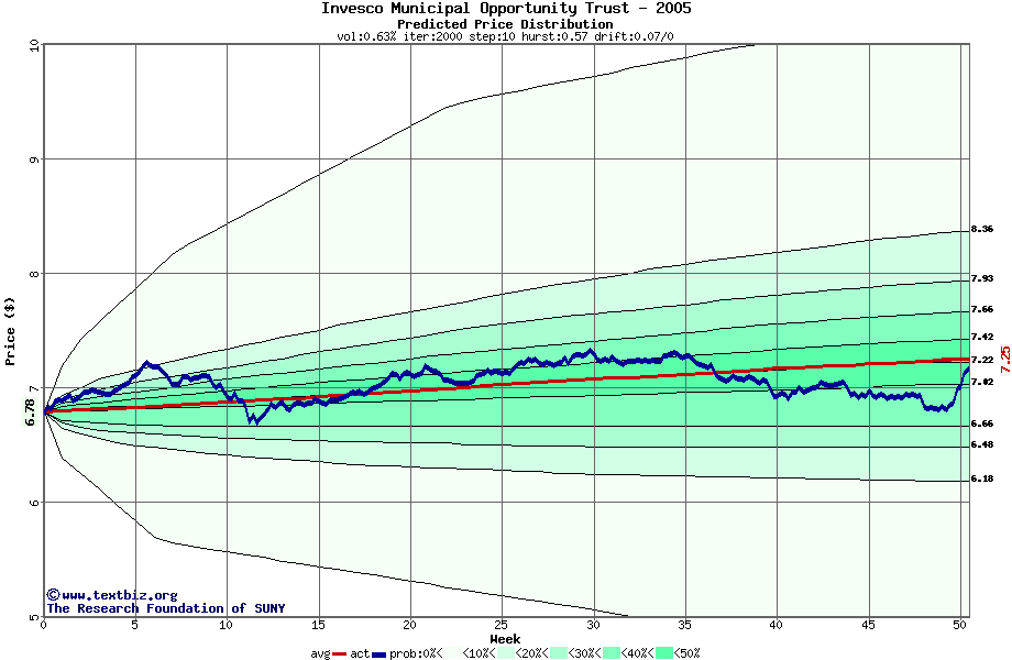 The high to date and low to date prices of the stock plotted against a random walk model for 2005 (what's this?).