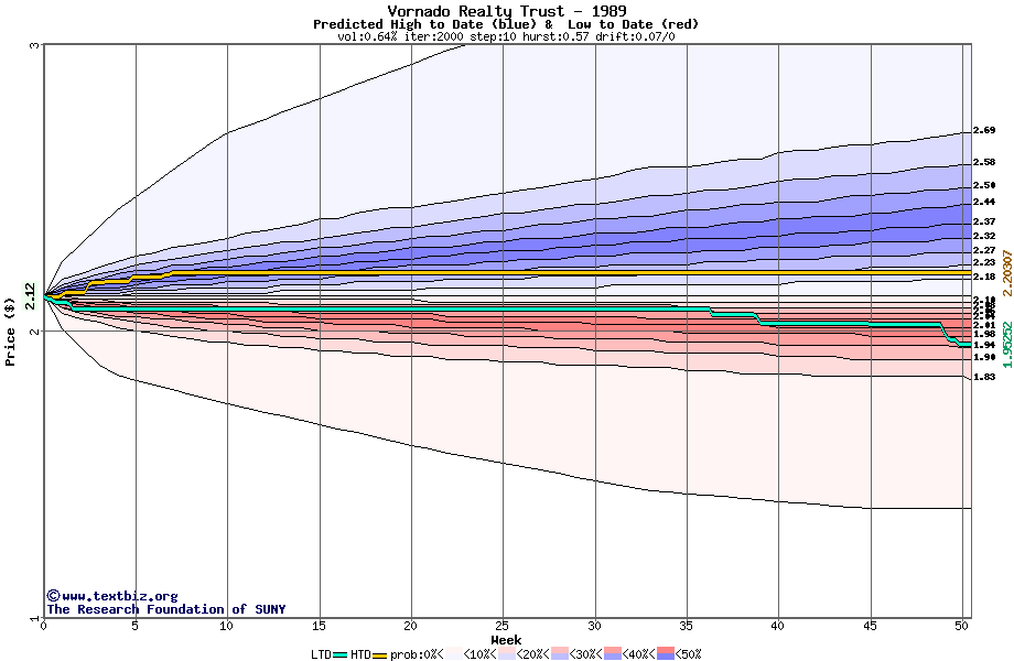 The high to date and low to date prices of the stock plotted against a random walk model for 1989 (what's this?).