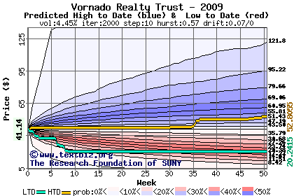 The high to date and low to date prices of the stock plotted against a random walk model for 2009 (what's this?).