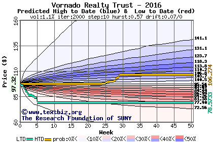 The high to date and low to date prices of the stock plotted against a random walk model for 2016 (what's this?).
