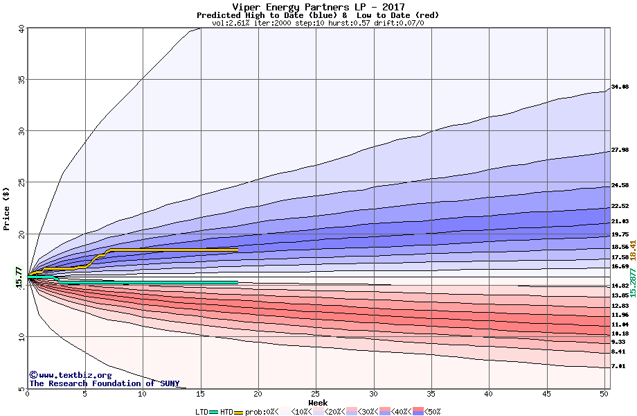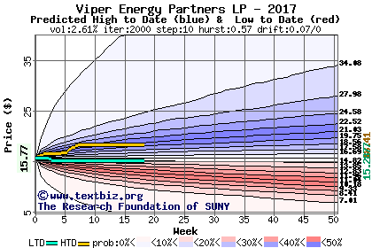 The high to date and low to date prices of the stock plotted against a random walk model for 2017 (what's this?).