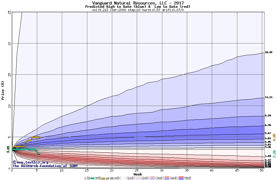 The high to date and low to date prices of the stock plotted against a random walk model for 2017 (what's this?).