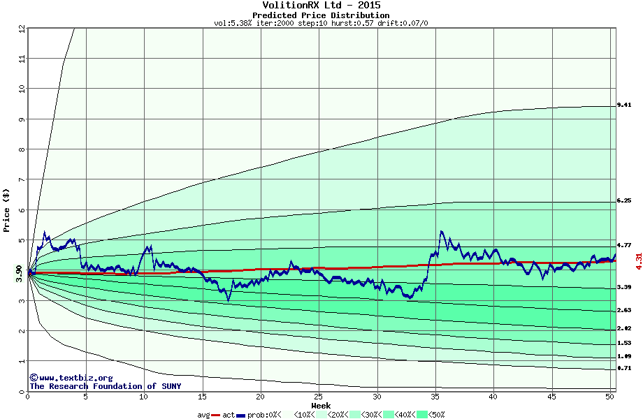 The following graph plots the year-to-date performance of the stock for 2015 compared to the probability calculated by a random walk model.