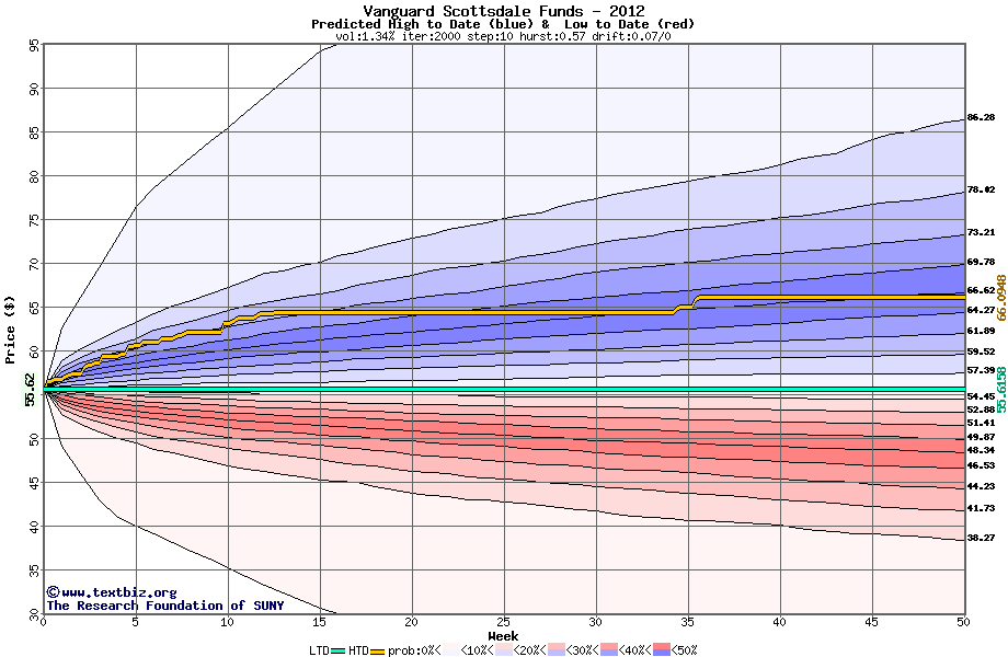The high to date and low to date prices of the stock plotted against a random walk model for 2012 (what's this?).