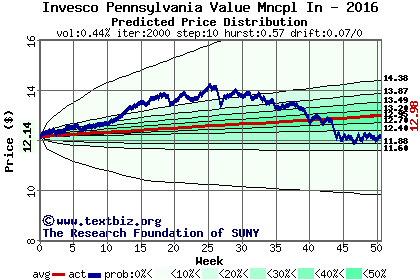 The high to date and low to date prices of the stock plotted against a random walk model for 2016 (what's this?).