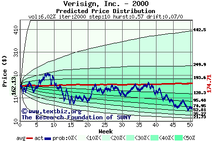 The high to date and low to date prices of the stock plotted against a random walk model for 2000 (what's this?).