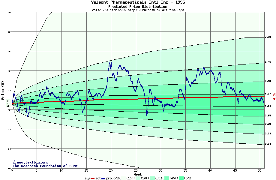 The following graph plots the year-to-date performance of the stock for 1996 compared to the probability calculated by a random walk model.