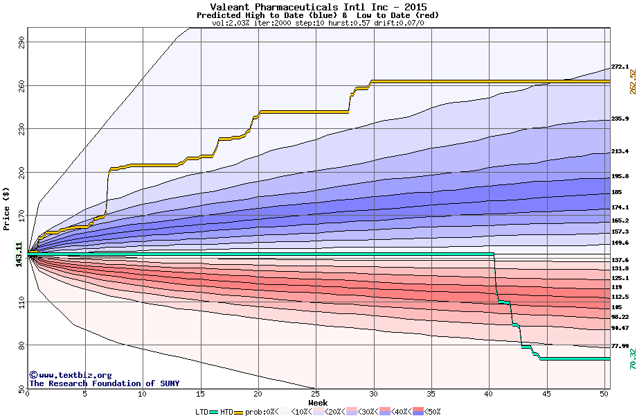 The high to date and low to date prices of the stock plotted against a random walk model for 2015 (what's this?).