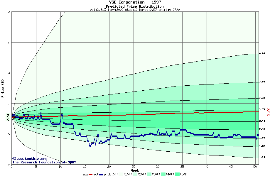 The high to date and low to date prices of the stock plotted against a random walk model for 1997 (what's this?).
