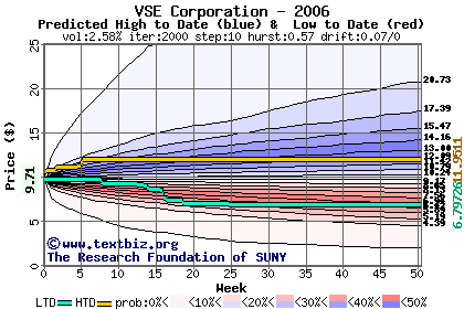 The high to date and low to date prices of the stock plotted against a random walk model for 2006 (what's this?).