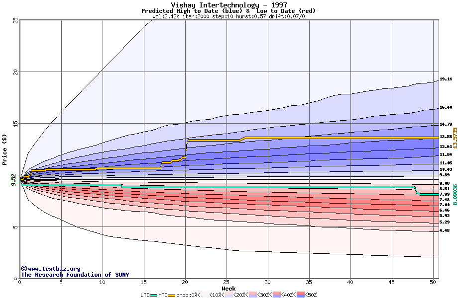 The high to date and low to date prices of the stock plotted against a random walk model for 1997 (what's this?).