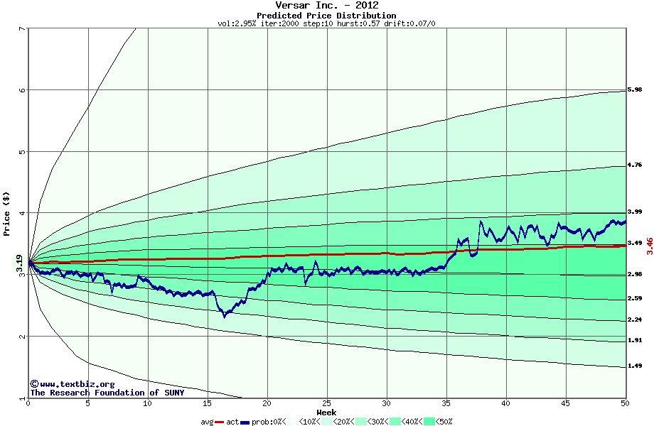 The following graph plots the year-to-date performance of the stock for 2012 compared to the probability calculated by a random walk model.