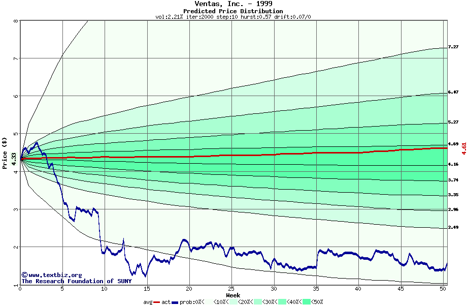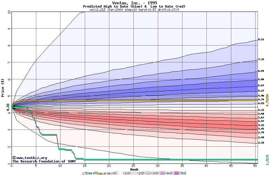 The high to date and low to date prices of the stock plotted against a random walk model for 1999 (what's this?).