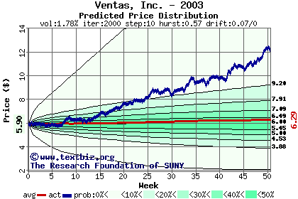 The high to date and low to date prices of the stock plotted against a random walk model for 2003 (what's this?).