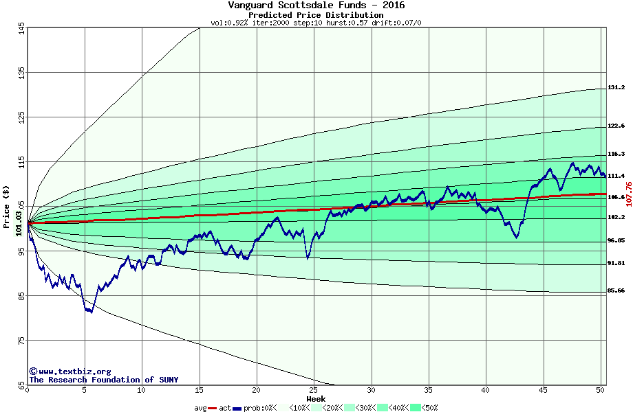 The following graph plots the year-to-date performance of the stock for 2016 compared to the probability calculated by a random walk model.