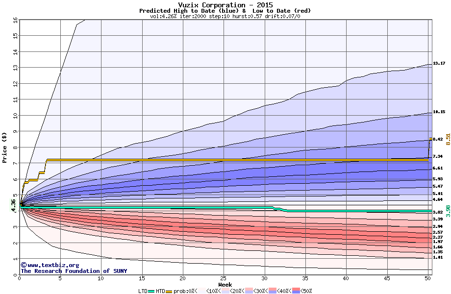 The following graph plots the year-to-date performance of the stock for 2015 compared to the probability calculated by a random walk model.