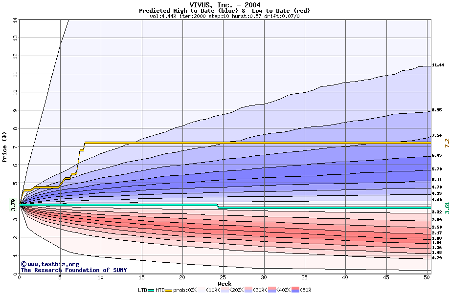The high to date and low to date prices of the stock plotted against a random walk model for 2004 (what's this?).