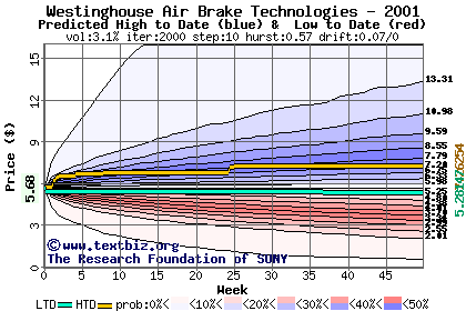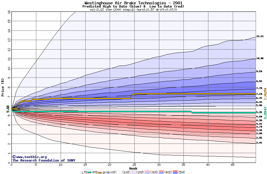 The high to date and low to date prices of the stock plotted against a random walk model for 2001 (what's this?).