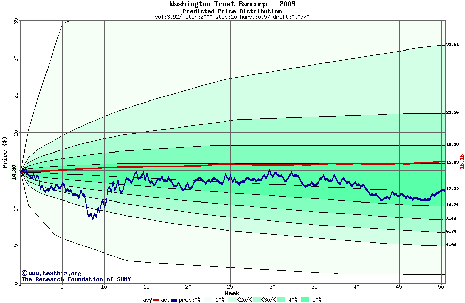The following graph plots the year-to-date performance of the stock for 2009 compared to the probability calculated by a random walk model.