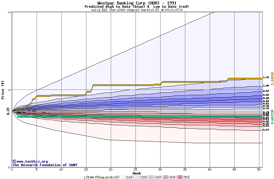 The high to date and low to date prices of the stock plotted against a random walk model for 1991 (what's this?).
