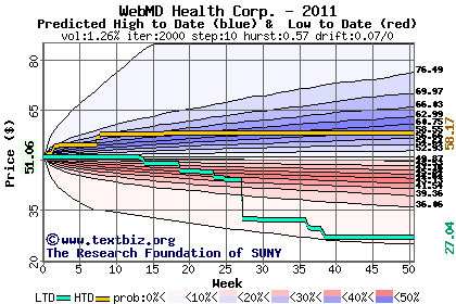 The high to date and low to date prices of the stock plotted against a random walk model for 2011 (what's this?).