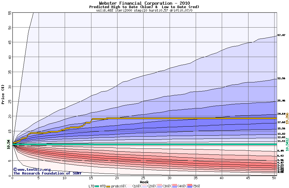 The high to date and low to date prices of the stock plotted against a random walk model for 2010 (what's this?).
