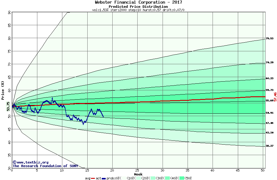 The high to date and low to date prices of the stock plotted against a random walk model for 2017 (what's this?).
