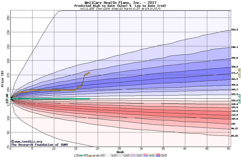 The high to date and low to date prices of the stock plotted against a random walk model for 2017 (what's this?).