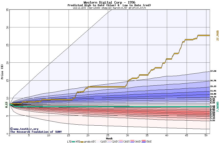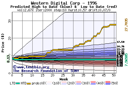 The high to date and low to date prices of the stock plotted against a random walk model for 1996 (what's this?).