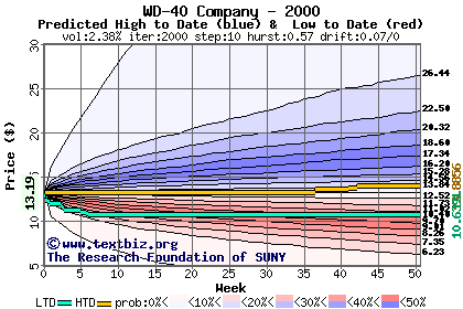 The high to date and low to date prices of the stock plotted against a random walk model for 2000 (what's this?).