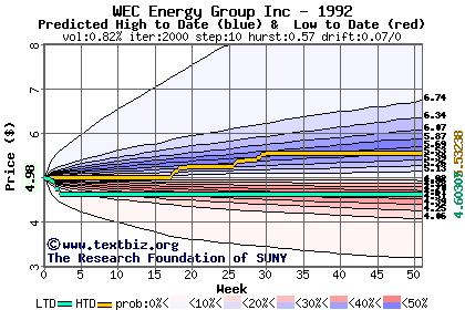 The high to date and low to date prices of the stock plotted against a random walk model for 1992 (what's this?).