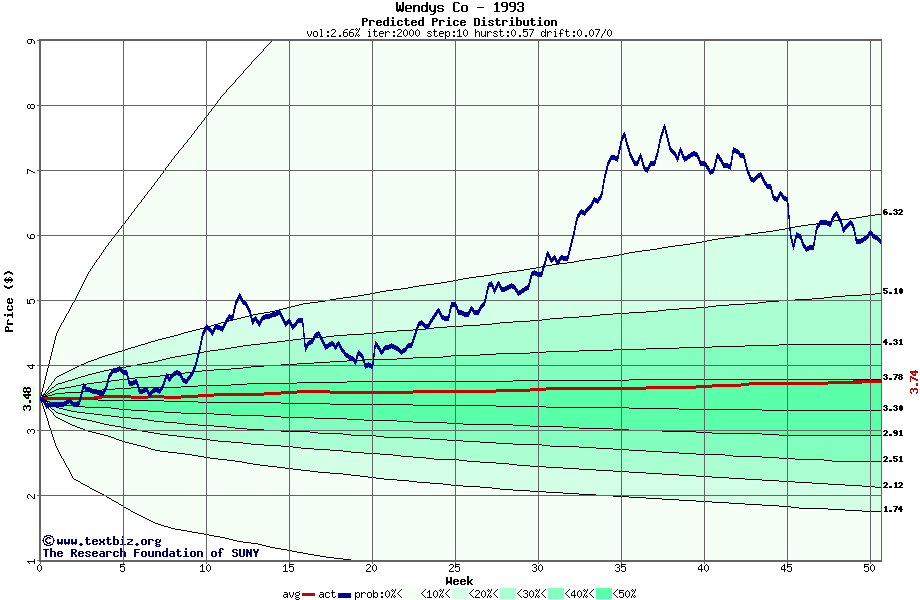 The following graph plots the year-to-date performance of the stock for 1993 compared to the probability calculated by a random walk model.