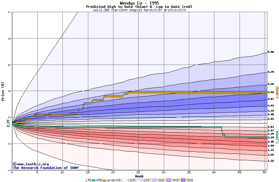 The high to date and low to date prices of the stock plotted against a random walk model for 1995 (what's this?).