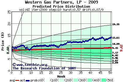 The high to date and low to date prices of the stock plotted against a random walk model for 2009 (what's this?).